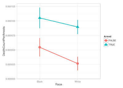 ReplyDeleteAlso, to test Rajiv's hypothesis, what we need is an estimate of the ratio of ratios (or if you want, the difference in differences) that shows that the rate of deaths/arrest is more skewed toward blacks when no gun is present. That would show that nonthreatening encounters are more likely to result in killings when the subject is black.